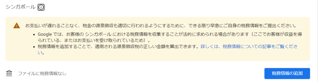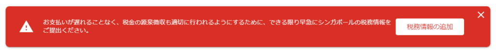 Google AdSenseのお支払い情報のページを開くと、真っ赤な背景にメッセージが記載されていました。内容は「できる限り早急にシンガポールの税務情報をご提出ください。」となっています。
