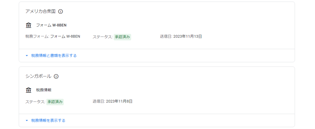 確認すると、「シンガポールの税務情報が承認されました」と表示されます。