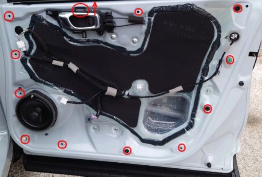 ドアの1ヶ所止まっているネジを外したら、エーモンのデッドニングキット付属の内張り剥がしを、クリップのあるところに挿し込ませ内張りを浮かしていきます。(全部で11ヶ所あり)下側から内張りを外していきます。ドアインナハンドルの赤丸のところは、ドアインナハンドルを押さえながら上にずらすようにして内張りを外します。車両カプラがドアと内張りとの間で繋がっていますので外すと、完全に内張りは外れます。※ スピーカー交換後にクリップはすべて内張り側に付けて、ドアに戻して下さい。