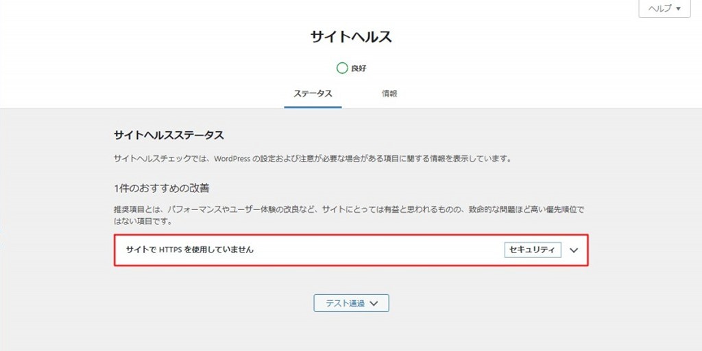 WordPressを新規にインストール、必要なプラグインをインストールしてダッシュボードのサイトヘルスを確認したら、「サイトでHTTPSを使用していません」という1件のおすすめの改善項目がありました。