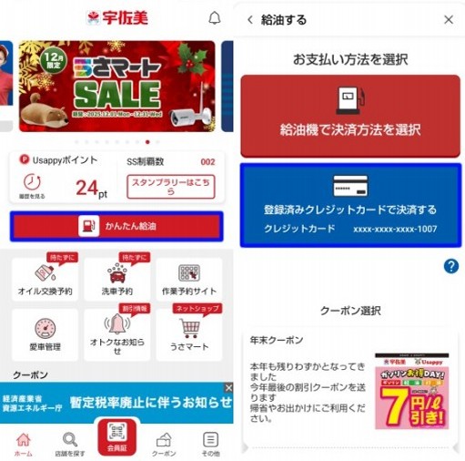 宇佐美アプリをインストールした後、クレジットカード番号を登録する事でQRコード決済サービスかんたん給油が利用可能となります。