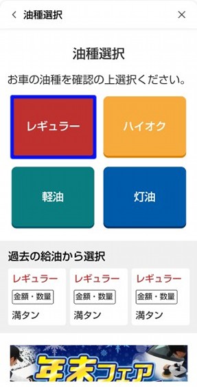次に「油種選択」(レギュラー満タン等)、「確認」画面が表示されますので、QRコードを表示して給油します。