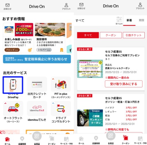 「Drive On」をインストールした後、クレジットカード番号や運転免許証番号等をサービスステーションで登録する事でQRコード決済サービス「モバイルDrivePay」が利用可能となります。