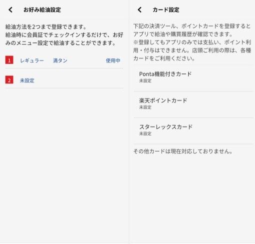 事前に「お好み給油設定」(2種類まで登録可能)および上記ポイントカードを紐付け設定をすることができます。※ ポイントカード紐付けは、サービスステーションで「モバイルDrivePay」登録と同時に行わないと上手く動作しないようです。