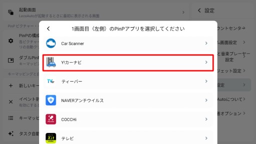 ポップアップメニュー「1画面目(左側)のPinPアプリを選択して下さい」から表示させたいアプリを選択します(上記画像では「Y!カーナビ」を選択します)