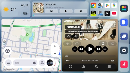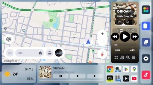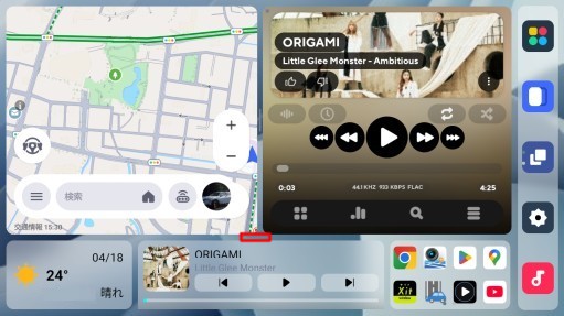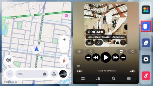 サイドバーの上から3番目(上図画面)のアイコンをタップして2画面/1画面の切替えを行います。左側のアプリ(この場合、Y!カーナビ)で1画面に切替わります。