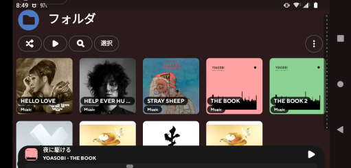 ファイルマネージャーなどのアプリで音楽を1つのフォルダ(例えばMusic)にまとめておきます。そのフォルダを音楽フォルダとして指定します。ライブラリにある右上の3点アイコンをタップしてください。「フォルダを選択」をタップするとAndroid端末に保管されているフォルダを閲覧できますので、音楽が保存されているフォルダにチェックマークを入れてください。