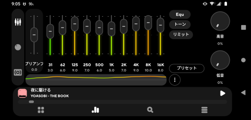 右上のイコライザアイコンをタップしてください。イコライザのフェーダーが表示されます。このフェーダーを動かして好きな音質に変更してください。難しい場合はイコライザのプリセットも指定できます。