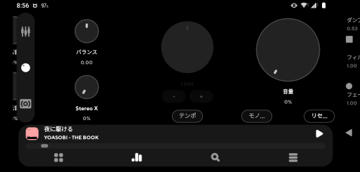 今度は上の3つのアイコンから真ん中のボリュームアイコンをタップします。「Stereo X」のツマミを変化させることで音楽により立体感を加えることができます。これも好きな音になるまで調節してください。モノラルで再生したい場合は左下の「モノラル」をタップします。
