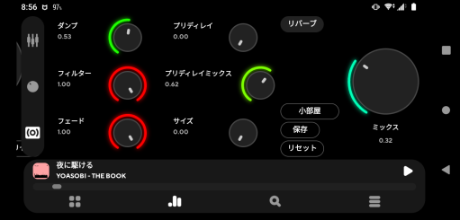 今度は上部の3つのアイコンから一番右にあるアイコンをタップします。左下の「リバーブ」をタップして機能をオンにします。すると、ツマミを調整できるようになりますので、こちらでも再生している音楽が好きな音質に変化するように調整してください。