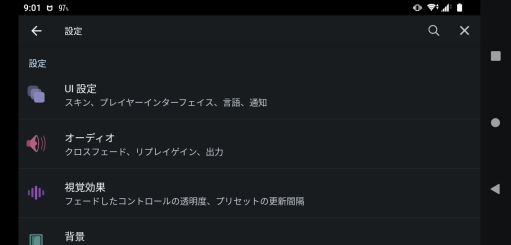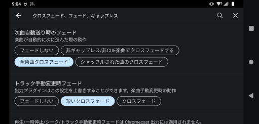 楽曲のクロスフェード機能やリプレイゲイン機能を使用したい場合、「オーディオ」の項目をタップしてください。クロスフェード機能とは今の楽曲をフェードアウトさせたら、次の楽曲を同時にフェードインさせるという機能となっています。