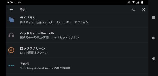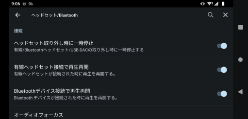 イヤホンなどをスマホのジャックに接続したり、外したりするときの楽曲の再生や一時停止の設定をする場合やBluetooth接続関連の調整をしたい場合、「ヘッドセット/Bluetooth」の項目をタップしてください。