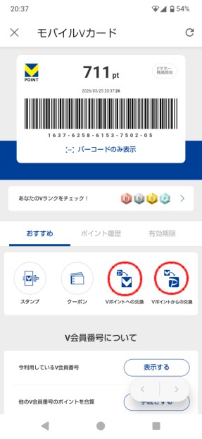 「Vポイントへの交換」または「Vポイントからの交換」をタップします。(赤丸のどちらか)