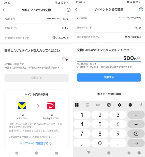 「Vポイントからの交換」を選択した場合は、交換したいVポイントを入力して「交換する」ボタンをタップします。(Vポイント500pt交換時)