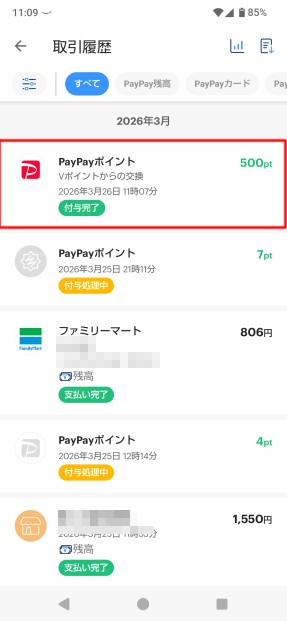 交換したVポイントは利用先に制限がありますが、交換したPayPayポイントはポイントの有効期限もありませんし、通常PayPayを利用しているユーザーであればこちらの交換のほうが幅広く使えます。